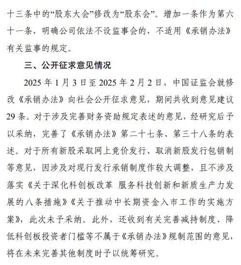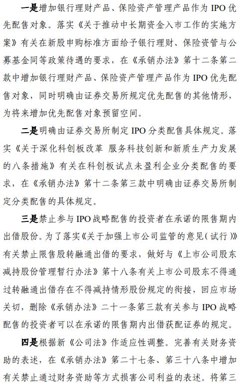 本次共对《证券发行与承销管理办法》(以下简称《承销办法》)的六个条文进行修改,主要内容包括:一是增加银行理财产品、保险资产管理产品作为IPO优先配售对象。落实《关于推动中长期资金入市工作的实施方案》有关在新股申购标准方面给予银行理财、保险资管与公募基金同等政策待遇的要求,在《承销办法》第十二条第二款中增加银行理财产品、保险资产管理产品作为IPO优先配售对象,同时明确由证券交易所规定优先配售的其他情形,为将来增加优先配售对象预留空间。二是明确由证券交易所制定IPO分类配售具体规定。落实《关于深化科创板改革服务科技创新和新质生产力发展的八条措施》有关在科创板试点未盈利企业分类配售的要求,在《承销办法》第十二条第三款中明确由证券交易所制定分类配售的具体规定。三是禁止参与IPO战略配售的投资者在承诺的限售期内出借股份。为了落实《关于加强上市公司监管的意见(试行)》有关禁止限售股转融通出借的要求,做好与《上市公司股东减持股份管理暂行办法》第十八条有关上市公司股东不得通过转融通出借存在不得减持情形股份规定的衔接,回应市场关切,删除《承销办法》第二十一条第三款有关参与IPO战略配售的投资者可以在承诺的限售期内出借获配证券的规定。四是根据新《公司法》作适应性调整。完善有关财务资助的表述,在《承销办法》第二十七条、第三十八条中增加有关禁止通过财务资助等方式损害公司利益的表述。增加一条作为第六十一条,明确公司依法不设监事会的,不适用《承销办法》有关监事的规定。将第三十三条中的“股东大会”修改为“股东会”。